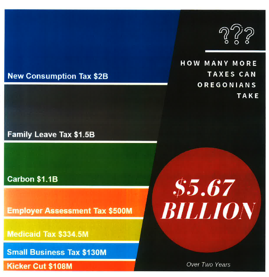 We want to reiterate four major tax hikes are being pushed by legislative leaders which total over $5B in a biennium. As of now, all four proposals are serious and viable. Please get familiar with and distribute this infographic. It is the story of the 2019 Oregon legislature.